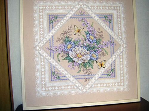 同じく、DIMENSIONS社のキットで、花とレースのデザインの額です。 ベージュの14カウントのアイーダです。