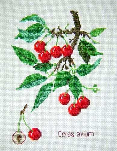 5月になりました。そろそろ、サクランボの季節です。 植物図鑑風のデザインが気に入って、刺した物です。 随分前の作品で、雑誌を見たと思うのですが、何に載っていたのか思い出せません。 サクランボ。これは西洋種でしょう。 Armeniaca vulgaris は アン…