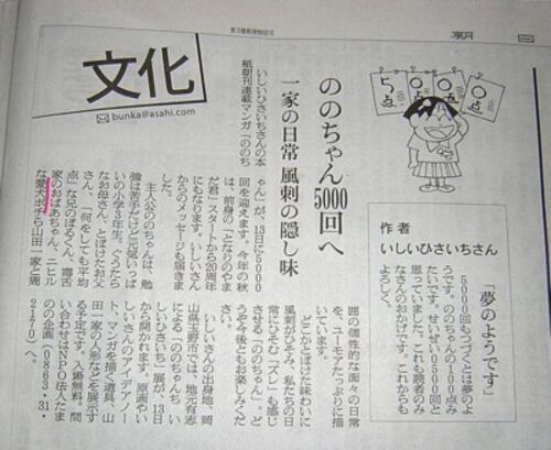 朝日新聞朝刊の連載漫画「ののちゃん」が大好きです。 毎朝、一番に見るのが「ののちゃん」。 連載が始まってから、今日で5000回だそうです。 もうそんなになるのですね。 おめでとうございます。 そして、こんなに長い間、毎日楽しませていただいて、有…